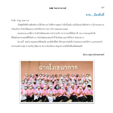 ตลอดระยะเวลาที่ผ่าน ป้าเล็กรับผิดชอบต่อการท างานบริการอาหารคนไข้ได้อย่างดี พวกเราขอบคุณป้าเล็ก