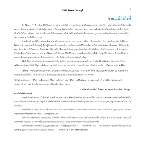 มาฝากเพื่อนร่วมงานเป็นประจ า ส่วนใหญ่จะเห็นพี่ทิพย์เป็นคนใจดี ไม่เคยมีอารมณ์โกรธเคืองใครง่ายๆ มีเพียงบ่นน้อยอกน้อยใจ นิดๆ หน่อยๆ เวลาไหว้วานน้อง ๆ เปล