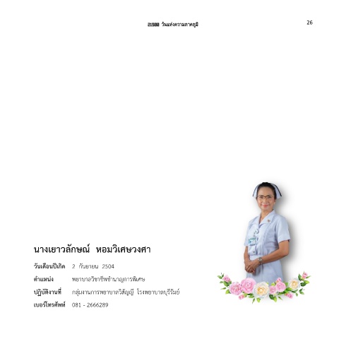 21900 วันแห่งความภาคภูมิ 26 นางเยาวลักษณ์ หอมวิเศษวงศา วันเดือนปีเกิด 2 กันยายน 2504 ต าแหน่ง พยาบาลวิชาชีพช านาญการพเศษ ิ ปฏิบัติงานที่ กลุ่มงานการพยาบาลวิสัญญี โรงพยาบาลบุรีรัมย์ เบอร์โทรศัพท์ 081 - 2666289