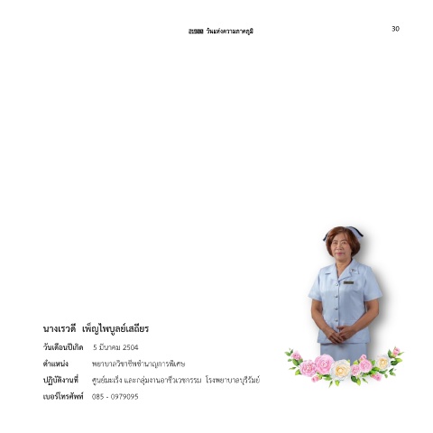 21900 วันแห่งความภาคภูมิ 30 นางเรวดี เพ็ญไพบูลย์เสถียร วันเดือนปีเกิด 5 มีนาคม 2504 ิ ต าแหน่ง พยาบาลวิชาชีพช านาญการพเศษ ปฏิบัติงานที่ ศูนย์มะเร็ง และกลุ่มงานอาชีวเวชกรรม โรงพยาบาลบุรีรัมย์ เบอร์โทรศัพท์ 085 - 0979095