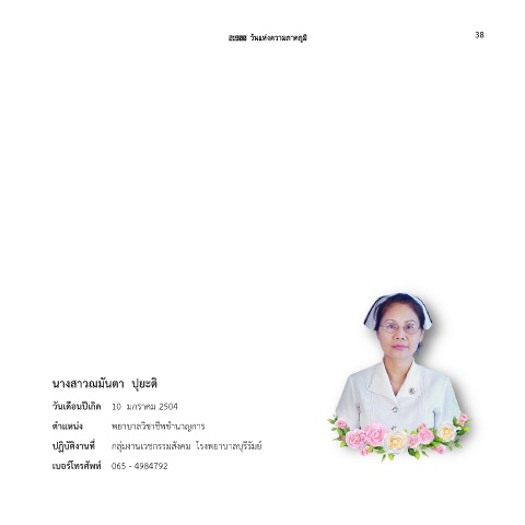 21900 วันแห่งความภาคภูมิ 38 นางสาวฌมันตา ปุยะติ วันเดือนปีเกิด 10 มกราคม 2504 ต าแหน่ง พยาบาลวิชาชีพช านาญการ ปฏิบัติงานที่ กลุ่มงานเวชกรรมสังคม โรงพยาบาลบุรีรัมย์ เบอร์โทรศัพท์ 065 - 4984792