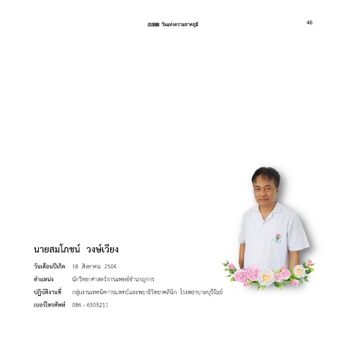 21900 วันแห่งความภาคภูมิ 46 นายสมโภชน์ วงษ์เวียง วันเดือนปีเกิด 18 สิงหาคม 2504 ต าแหน่ง นักวิทยาศาสตร์การแพทย์ช านาญการ ปฏิบัติงานที่ กลุ่มงานเทคนิคการแพทย์และพยาธิวิทยาคลินิก โรงพยาบาลบุรีรัมย์ เบอร์โทรศัพท์ 086 - 6505211