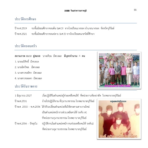 1 มิถุนายน 2527 เริ่มปฏิบัติในต าแหน่งผู้ช่วยเหลือคนไข้ ที่หน่วยงานห้องผ่าตัด โรงพยาบาลบุรีรัมย์