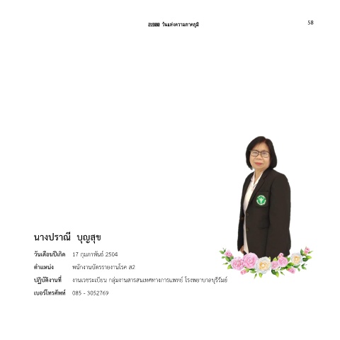 21900 วันแห่งความภาคภูมิ 58 นางปราณี บุญสุข วันเดือนปีเกิด 17 กุมภาพันธ์ 2504 ต าแหน่ง พนักงานบัตรรายงานโรค ส2 ปฏิบัติงานที่ งานเวชระเบียน กลุ่มงานสารสนเทศทางการแพทย์ โรงพยาบาลบุรีรัมย์ เบอร์โทรศัพท์ 085 - 3052769
