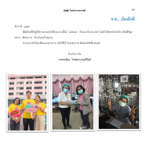 พี่ณีเป็นพี่ที่ปฏิบัติงานตามหน้าที่ด้วยความตั้งใจ ไม่คอยลา ถึงจะลาก็ลาล่วงหน้า ไม่ท าให้หัวหน้าหนักใจ เป็นพี่ที่พูด