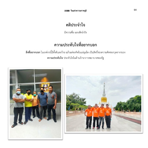 21900 วันแห่งความภาคภูมิ 64 คติประจ าใจ มีความซื่อ และสัตย์จริง ความประทับใจที่อยากบอก สิ่งทอยากบอก ในองค์กรนี้มีทั้งดีและร้าย แล้วแต่จะคิดในแง่มุมใด เป็นสิทธิ์ของความคิดของบุคลากรเอง ี่ ความประทับใจ ประทับใจในด้านรักษาการพยาบาลของรัฐ