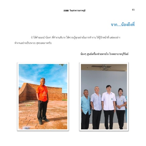 21900 วันแห่งความภาคภูมิ 65 จาก....น้องถึงพี่ ป๋าให้ค าแนะน าน้องๆ ที่ท างานดีมาก ให้ความรู้ทุกอย่างในการท างาน ให้รู้จักหน้าที่ แต่ละอย่าง ท างานอย่างเป็นระบบ สุดยอดมากครับ น้องๆ ศูนย์เครื่องช่วยหายใจ โรงพยาบาลบุรีรัมย์