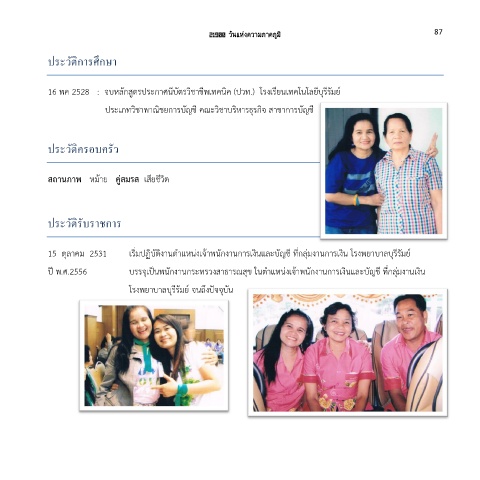 15 ตุลาคม 2531 เริ่มปฏิบัติงานต าแหน่งเจ้าพนักงานการเงินและบัญชี ที่กลุ่มงานการเงิน โรงพยาบาลบุรีรัมย์