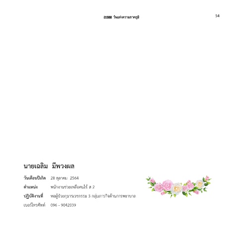 21900 วันแห่งความภาคภูมิ 54 นายเฉลิม มีพวงผล วันเดือนปีเกิด 28 ตุลาคม 2564 ต าแหน่ง พนักงานช่วยเหลือคนไข้ ส 2 ปฏิบัติงานที่ หอผู้ป่วยกุมารเวชกรรม 3 กลุ่มภารกิจด้านการพยาบาล เบอร์โทรศัพท์ 096 - 9042039