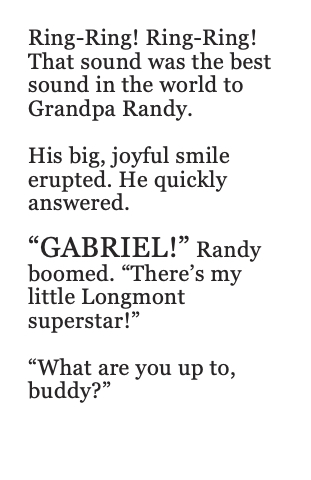 Ring-Ring! Ring-Ring! That sound was the best sound in the world to Grandpa Randy. His big, joyful smile erupted. He quickly answered. “GABRIEL!” Randy boomed. “There’s my little Longmont superstar!” “What are you up to, buddy?”