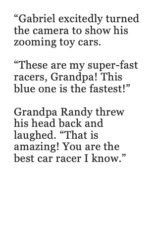 “Gabriel excitedly turned the camera to show his zooming toy cars. “These are my super-fast racers, Grandpa! This blue one is the fastest!” Grandpa Randy threw his head back and laughed. “That is amazing! You are the best car racer I know.”