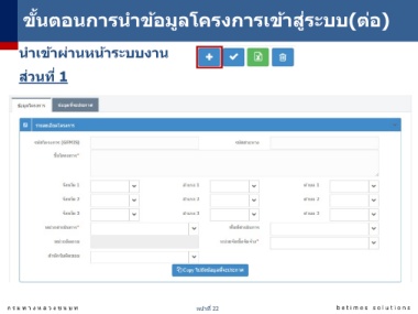 ขั้นตอนการน าข้อมูลโครงการเข้าสู่ระบบ(ต่อ) น าเข้าผ่านหน้าระบบงาน ส่วนที่ 1 ก ร ม ท า ง ห ล ว ง ช น บ ท หน้าที่ 22 b e t i m e s s o l u t i o n s