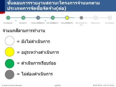 ขั้นตอนการรายงานสถานะโครงการจ าแนกตาม ประเภทการจัดซื้ อจัดจ้าง(ต่อ) จ าแนกสีตามการท างาน = ยังไม่ด าเนินการ = อยู่ระหว่างด าเนินการ = ด าเนินการเรียบร ้อย = ไม่ต ้องด าเนินการ ก ร ม ท า ง ห ล ว ง ช น บ ท หน้าที่ 34 b e t i m e s s o l u t i o n s