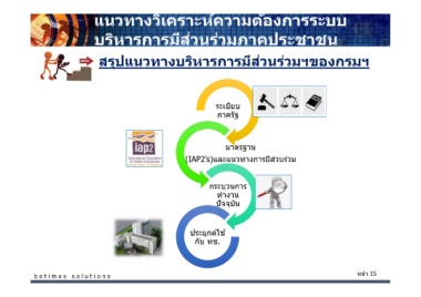 หน้า 15 สรุปแนวทางบริหารการมีส่วนร่วมฯของกรมฯ แนวทางวิเคราะห์ความต้องการระบบ บริหารการมีส่วนร่วมภาคประชาชน มาตรฐาน (IAP2’s)และแนวทางการมีส่วนร่วม ระเบียบ ภาครัฐ กระบวนการ ทํางาน ปัจจุบัน ้ ประยุกต์ใช กับ ทช. o n s o l u t i m e s s b e t i