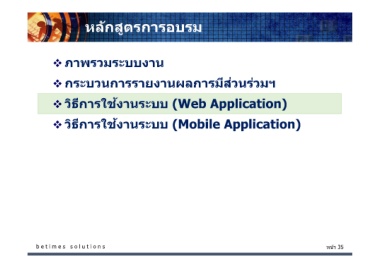 หน้า 35 ั หลกสูตรการอบรม ภาพรวมระบบงาน กระบวนการรายงานผลการมีส่วนร่วมฯ วิธีการใช้งานระบบ (Web Application) วิธีการใช้งานระบบ (Mobile Application) b e t i m e s s o l u t i o n s