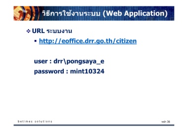 หน้า 36 วิธีการใช้งานระบบ (Web Application) URL ระบบงาน b e t i m e s s o l u t i o n s http://eoffice.drr.go.th/citizen user : drr\pongsaya_e password : mint10324