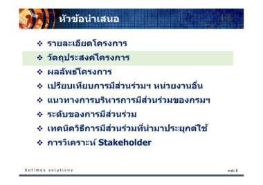 ั หวข้อนําเสนอ รายละเอียดโครงการ วตถุประสงค์โครงการ ผลลพธ์โครงการ เปรียบเทียบการมีส่วนร่วมฯ หน่วยงานอื่น แนวทางการบริหารการมีส่วนร่วมของกรมฯ ระดบของการมีส่วนร่วม เทคนิควิธีการมีส่วนร่วมที่นํามาประยุกต์ใช้ การวิเคราะห์ Stakeholder