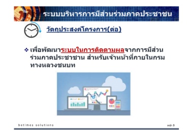 หน้า 9 ระบบบริหารการมีส่วนร่วมภาคประชาชน เพื่อพฒนาระบบในการติดตามผลจากการมีส่วน วตถุประสงค์โครงการ(ต่อ) ั ร่วมภาคประชาชาน สําหรบเจ้าหน้าที่ภายในกรม b e t i m e s s o l u t i o n s ั ทางหลวงชนบท ั