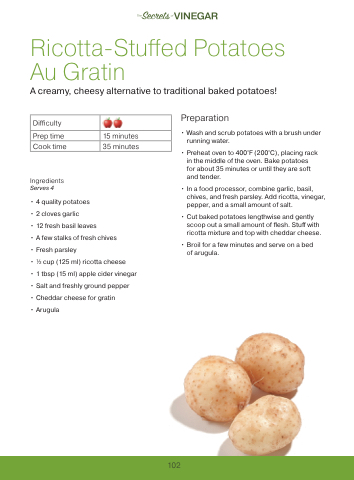 • Cut baked potatoes lengthwise and gently scoop out a small amount of flesh. Stuff with ricotta mixture and top with cheddar cheese.