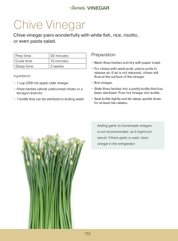 Chive vinegar pairs wonderfully with white fish, rice, risotto, or even pasta salad.
