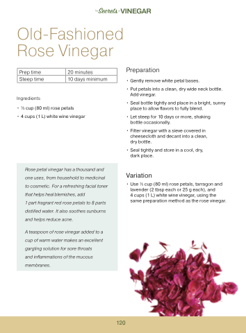 A teaspoon of rose vinegar added to a cup of warm water makes an excellent gargling solution for sore throats