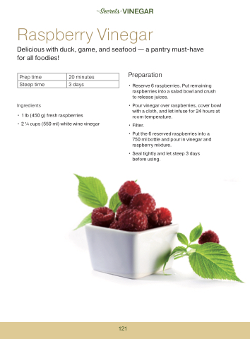 • Pour vinegar over raspberries, cover bowl with a cloth, and let infuse for 24 hours at room temperature.