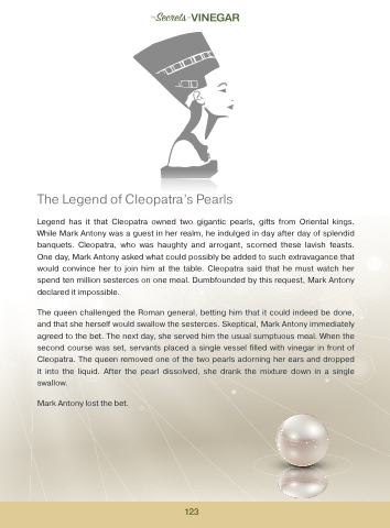 The queen challenged the Roman general, betting him that it could indeed be done, and that she herself would swallow the sesterces. Skeptical, Mark Antony immediately agreed to the bet. The next day, she served him the usual sumptuous meal. When the second course was set, servants placed a single vessel filled with vinegar in front of Cleopatra. The queen removed one of the two pearls adorning her ears and dropped it into the liquid. After the pearl dissolved, she drank the mixture down in a single swallow.