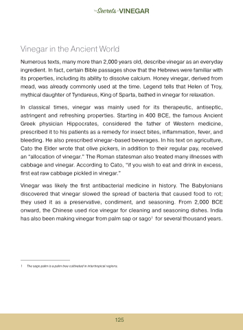 In classical times, vinegar was mainly used for its therapeutic, antiseptic, astringent and refreshing properties. Starting in 400 BCE, the famous Ancient Greek physician Hippocrates, considered the father of Western medicine, prescribed it to his patients as a remedy for insect bites, inflammation, fever, and bleeding. He also prescribed vinegar-based beverages. In his text on agriculture, Cato the Elder wrote that olive pickers, in addition to their regular pay, received an “allocation of vinegar.” The Roman statesman also treated many illnesses with cabbage and vinegar. According to Cato, “if you wish to eat and drink in excess, first eat raw cabbage pickled in vinegar.”