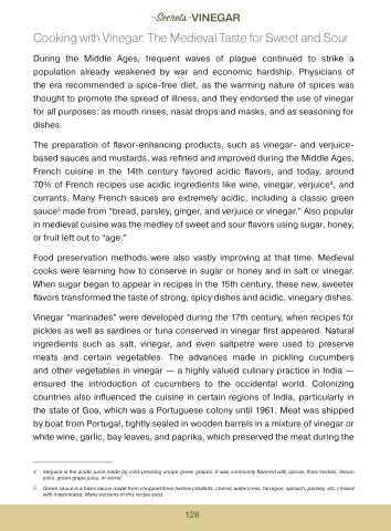The preparation of flavor-enhancing products, such as vinegar- and verjuice- based sauces and mustards, was refined and improved during the Middle Ages. French cuisine in the 14th century favored acidic flavors, and today, around 70% of French recipes use acidic ingredients like wine, vinegar, verjuice4, and currants. Many French sauces are extremely acidic, including a classic green sauce5 made from “bread, parsley, ginger, and verjuice or vinegar.” Also popular in medieval cuisine was the medley of sweet and sour flavors using sugar, honey, or fruit left out to “age.”