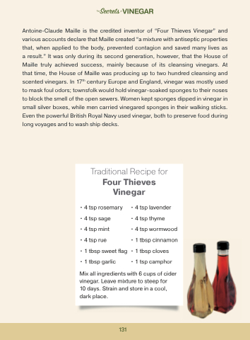 Antoine-Claude Maille is the credited inventor of “Four Thieves Vinegar” and various accounts declare that Maille created “a mixture with antiseptic properties that, when applied to the body, prevented contagion and saved many lives as a result.” It was only during its second generation, however, that the House of Maille truly achieved success, mainly because of its cleansing vinegars. At that time, the House of Maille was producing up to two hundred cleansing and scented vinegars. In 17th century Europe and England, vinegar was mostly used to mask foul odors; townsfolk would hold vinegar-soaked sponges to their noses to block the smell of the open sewers. Women kept sponges dipped in vinegar in small silver boxes, while men carried vinegared sponges in their walking sticks. Even the powerful British Royal Navy used vinegar, both to preserve food during long voyages and to wash ship decks.