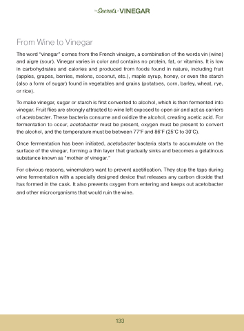 To make vinegar, sugar or starch is first converted to alcohol, which is then fermented into vinegar. Fruit flies are strongly attracted to wine left exposed to open air and act as carriers of acetobacter. These bacteria consume and oxidize the alcohol, creating acetic acid. For fermentation to occur, acetobacter must be present, oxygen must be present to convert the alcohol, and the temperature must be between 77°F and 86°F (25°C to 30°C).