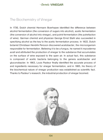In 1730, Dutch chemist Hermann Boerhaave identified the difference between alcohol fermentation (the conversion of sugars into alcohol), acetic fermentation (the conversion of alcohol into vinegar), and putrid fermentation (the putrefaction of wine). German chemist and physician George Ernst Stahl also succeeded in specifying alcohol as the key to the acetic fermentation process. In 1822, Dutch botanist Christiaan Hendrik Persoon discovered acetobacter, the microorganism responsible for fermentation. Believing it to be a fungus, he named it mycoderma aceti and attributed the production of vinegar to the substance that accumulates on the surface of wine exposed to the open air. In actual fact, this substance is composed of acetic bacteria belonging to the genera acetobacter and gluconobacter. In 1863, Louis Pasteur finally identified the accurate process of and ingredients necessary for vinegar fermentation, and in 1865, his theory of the biochemical nature of vinegar production was established as scientific fact. Thanks to Pasteur’s research, the industrial production of vinegar boomed.