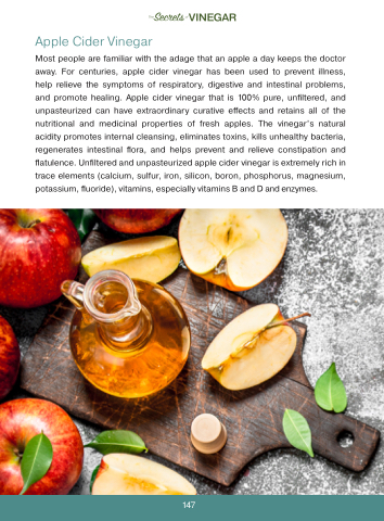 Most people are familiar with the adage that an apple a day keeps the doctor away. For centuries, apple cider vinegar has been used to prevent illness, help relieve the symptoms of respiratory, digestive and intestinal problems, and promote healing. Apple cider vinegar that is 100% pure, unfiltered, and unpasteurized can have extraordinary curative effects and retains all of the nutritional and medicinal properties of fresh apples. The vinegar’s natural acidity promotes internal cleansing, eliminates toxins, kills unhealthy bacteria, regenerates intestinal flora, and helps prevent and relieve constipation and flatulence. Unfiltered and unpasteurized apple cider vinegar is extremely rich in trace elements (calcium, sulfur, iron, silicon, boron, phosphorus, magnesium, potassium, fluoride), vitamins, especially vitamins B and D and enzymes.