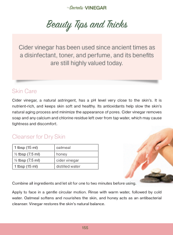 Cider vinegar, a natural astringent, has a pH level very close to the skin’s. It is nutrient-rich, and keeps skin soft and healthy. Its antioxidants help slow the skin’s natural aging process and minimize the appearance of pores. Cider vinegar removes soap and any calcium and chlorine residue left over from tap water, which may cause tightness and discomfort.