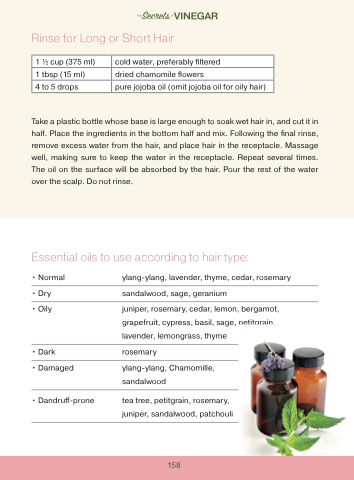Take a plastic bottle whose base is large enough to soak wet hair in, and cut it in half. Place the ingredients in the bottom half and mix. Following the final rinse, remove excess water from the hair, and place hair in the receptacle. Massage well, making sure to keep the water in the receptacle. Repeat several times. The oil on the surface will be absorbed by the hair. Pour the rest of the water over the scalp. Do not rinse.
