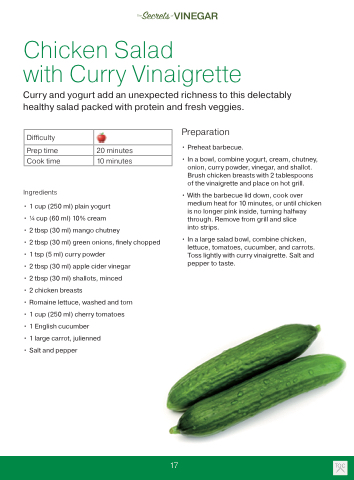 • In a large salad bowl, combine chicken, lettuce, tomatoes, cucumber, and carrots. Toss lightly with curry vinaigrette. Salt and pepper to taste.
