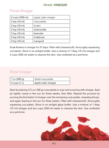 Start by placing 3.5 oz (100 g) rose petals in a jar and covering with vinegar. Seal jar tightly. Leave in the sun for three weeks, then filter. Repeat the process by pouring the first batch of vinegar over the remaining rose petals, resealing the jar, and again leaving in the sun for three weeks. Filter with cheesecloth, thoroughly squeezing out petals. Store in an airtight glass bottle. Use a mixture of 1 tbsp (15 ml) vinegar and two cups (500 ml) water to cleanse the skin. Use undiluted as a perfume.