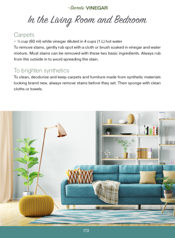 To clean, deodorize and keep carpets and furniture made from synthetic materials looking brand new, always remove stains before they set. Then sponge with clean cloths or towels.