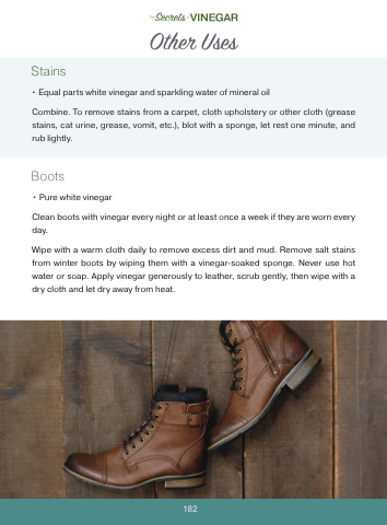 Wipe with a warm cloth daily to remove excess dirt and mud. Remove salt stains from winter boots by wiping them with a vinegar-soaked sponge. Never use hot water or soap. Apply vinegar generously to leather, scrub gently, then wipe with a dry cloth and let dry away from heat.