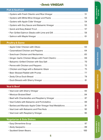 • Balsamic-Grilled Chicken with Sea Salt . . • Penne with Chicken and Peppers . ..... . • Chicken and Sage with a Balsamic Glaze • Beer-Braised Rabbit with Prunes . ..... . • Zesty Citrus Duck Breast . . . . . . . ..... . • Duck Breasts with Sherry Vinegar ..... .
