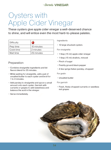 • Add parsley to vinaigrette and spoon a small amount onto each oyster. Garnish with currants or grapes to add sweetness and balance the acid in the vinegar.