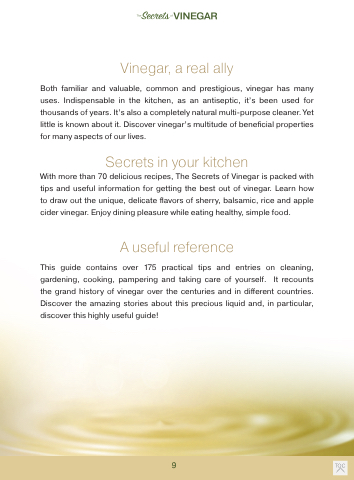 This guide contains over 175 practical tips and entries on cleaning, gardening, cooking, pampering and taking care of yourself. It recounts the grand history of vinegar over the centuries and in different countries. Discover the amazing stories about this precious liquid and, in particular, discover this highly useful guide!