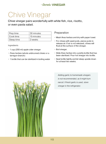 Chive vinegar pairs wonderfully with white fish, rice, risotto, or even pasta salad.