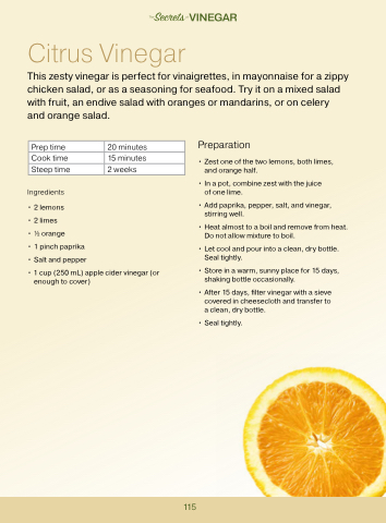 This zesty vinegar is perfect for vinaigrettes, in mayonnaise for a zippy chicken salad, or as a seasoning for seafood. Try it on a mixed salad with fruit, an endive salad with oranges or mandarins, or on celery and orange salad.