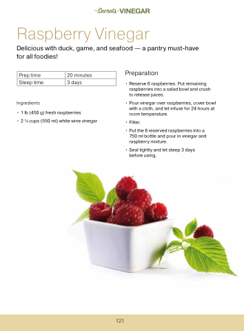 • Pour vinegar over raspberries, cover bowl with a cloth, and let infuse for 24 hours at room temperature.