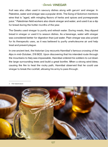 fruit was also often used in savoury dishes along with garum3 and vinegar. In Palestine, water and vinegar was a popular drink. The Song of Solomon mentions wine that is “aged, with mingling flavors of herbs and spices and pomegranate juice.” Palestinian field workers also drank vinegar and water, and used it as a dip for bread during the hotter months of the year.