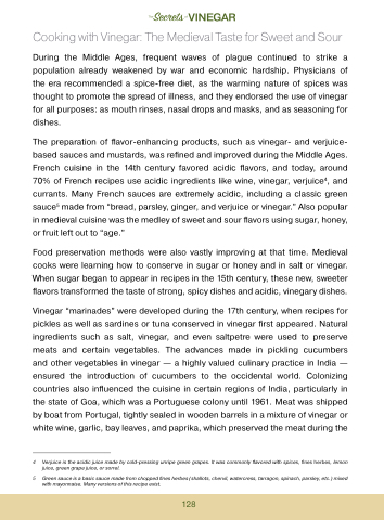 The preparation of flavor-enhancing products, such as vinegar- and verjuice- based sauces and mustards, was refined and improved during the Middle Ages. French cuisine in the 14th century favored acidic flavors, and today, around 70% of French recipes use acidic ingredients like wine, vinegar, verjuice4, and currants. Many French sauces are extremely acidic, including a classic green sauce5 made from “bread, parsley, ginger, and verjuice or vinegar.” Also popular in medieval cuisine was the medley of sweet and sour flavors using sugar, honey, or fruit left out to “age.”
