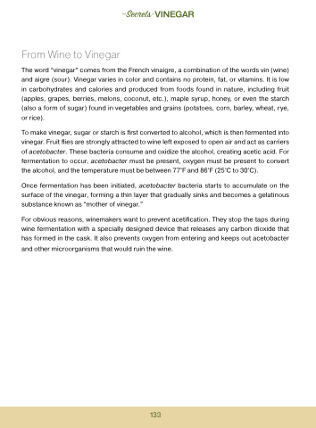 To make vinegar, sugar or starch is first converted to alcohol, which is then fermented into vinegar. Fruit flies are strongly attracted to wine left exposed to open air and act as carriers of acetobacter. These bacteria consume and oxidize the alcohol, creating acetic acid. For fermentation to occur, acetobacter must be present, oxygen must be present to convert the alcohol, and the temperature must be between 77°F and 86°F (25°C to 30°C).