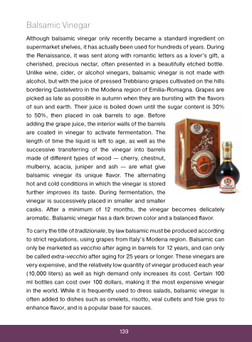 casks. After a minimum of 12 months, the vinegar becomes delicately aromatic. Balsamic vinegar has a dark brown color and a balanced flavor.