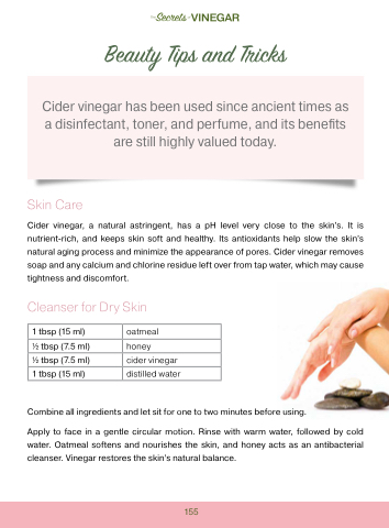 Cider vinegar, a natural astringent, has a pH level very close to the skin’s. It is nutrient-rich, and keeps skin soft and healthy. Its antioxidants help slow the skin’s natural aging process and minimize the appearance of pores. Cider vinegar removes soap and any calcium and chlorine residue left over from tap water, which may cause tightness and discomfort.